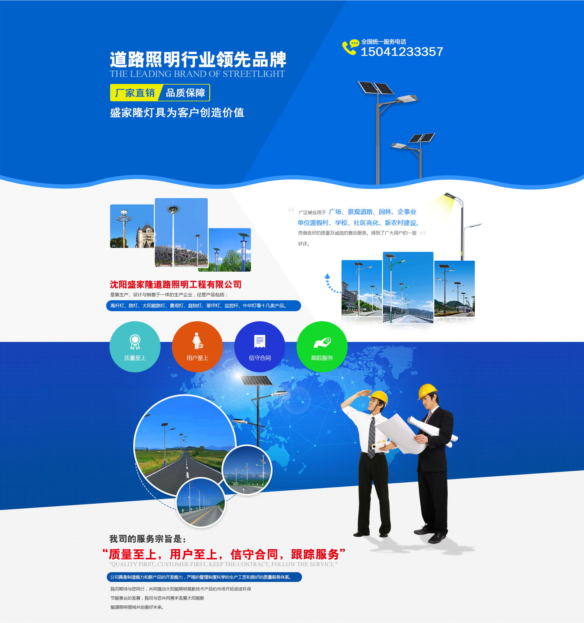沈陽盛家隆道路照明工程有限公司坐落于沈陽市于洪區(qū)興盛村愛國,生產(chǎn)各種室外,道路,廣場,車站,碼頭,橋梁,庭院及室內(nèi)工礦照明燈具,品種有太陽能路燈,道路燈,LED路燈,組合燈,景觀燈,庭院燈,草坪燈,彩色泛光燈,中高桿燈以及配套使用的各種路燈頭,鎮(zhèn)流器,觸發(fā)器開關(guān)箱等系列產(chǎn)品。 本公司自成立以來,已初具規(guī)模,現(xiàn)有高級技術(shù)人員5人,中級技術(shù)人員28人,研究設(shè)計人員14人,車間工人百余人,并備有大型斬彎機,1600t-900t壓鑄機,20t行吊,高速縱剪機,埋弧自動焊,彩色噴塑線燈先進設(shè)備,高科技創(chuàng)造高質(zhì)量,由我公司生產(chǎn)的各種類型的照明燈具,不僅質(zhì)量可靠而且線條流暢,外形美觀,深受廣大客戶的喜愛,長期以來,我公司一直注重產(chǎn)品質(zhì)量,堅持“質(zhì)量是企業(yè)的生命”的宗旨。由于質(zhì)量可靠,價格合理,服務(wù)周到,從而贏得了廣泛的市場聲譽。企業(yè)先后被評為“質(zhì)量信得過企業(yè)”“重誠信守信用企業(yè)”,“AAA級資信企業(yè)”,并通過ISO9001:2000國際質(zhì)量體系認證,ISO14001:2004環(huán)境管理體系認證,CCC,CQC國家強制性產(chǎn)品認證和持有道路照明二級安裝,安全生產(chǎn)資質(zhì)。